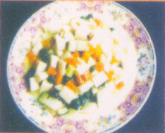 2、锅上火,鱼肉肠丁、胡萝卜丁、青椒三丁爆炒盛入盘中即可。