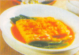 2、锅上火,放入汤、瑶柱、调味料、湿生粉勾芡,最后把勾芡的汤在鱼糕上即可。